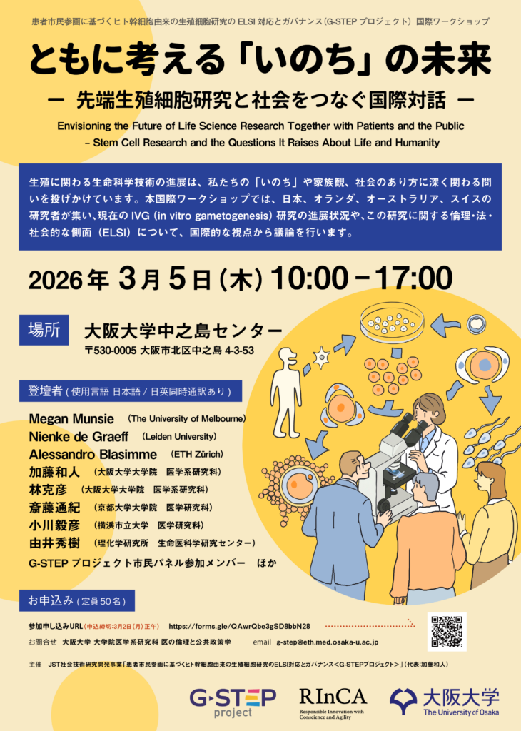 生殖に関わる生命科学の進展は、私たちの「いのち」や家族観、社会のあり方に深く関わる問いを投げかけています。本国際ワークショップでは、日本、オランダ、オーストラリア、スイスの研究者が集い、現在のIVG(in vitro gametogenesis)研究の進展状況や、この研究に関する倫理・法・社会的な側面(ELSI)について、国際的な視点から議論を行います。